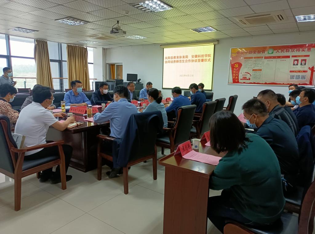 为积极探索师范生教育实践工作,建立高校、地方教育行政部门和基础教育学校权责明晰、稳定协调、合作共赢的“三位一体”师范生协同培养机制,构建教师培养、培训、研究和服务一体化的合作共同体,推动我校师范类专业认证工作,4月12日下午,江南官方网站_江南(中国)股份有限公司,与凤阳县教育体育局协同培养师范生合作协议签署仪式在凤阳县教育体育局三楼会议室隆重举行。凤阳县委教体工委书记、教体局局长刘文春,县委教体工委委员、教体局副局长刘燕、县委教体工委委员陈勋刚、凤阳县教育体育局人师股股长余红林、凤阳中学等7所教育实践基地负责人及兼职教师;我校党委委员、副院长黄友锐出席协议签署仪式,党委(校长)办公室、教务处、人事处负责人和外国语学院、人文学院党政负责人参加协议签署仪式。签约仪式由我校党委(院长)办公室主任曾献功主持。