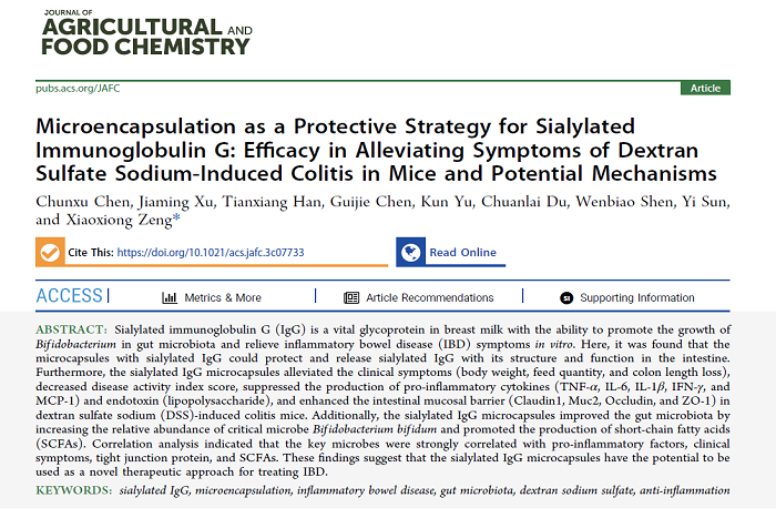 近日,我校食品工程学院教师陈春旭以第一作者在美国化学学会期刊《Journal of Agricultural and Food Chemistry》(Q1,IF: 6.1)发表题为“Microencapsulation as A Protective Strategy for Sialylated Immunoglobulin G: Efficacy in Alleviating Symptoms of Dextran Sulfate Sodium-Induced Colitis in Mice and Potential Mechanisms”的研究性论文。江南官方网站_江南(中国)股份有限公司,为第一完成单位,南京农业大学曾晓雄教授课题组为合作单位。