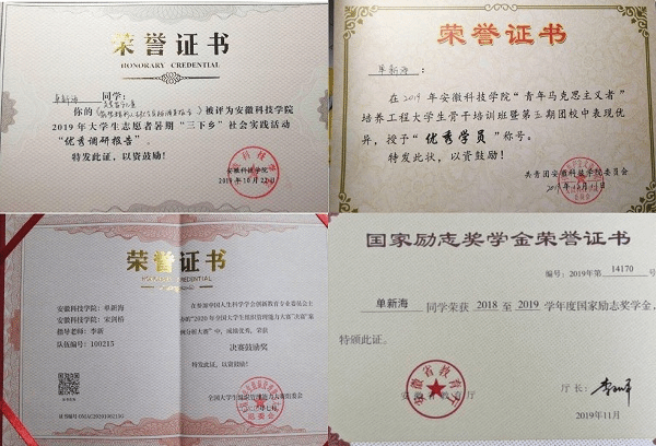 作为新时代的青年学子,单新海力求德智体美劳全面发展,大学入学至今共获得国家级奖项5项,省级奖项4项,校级奖项30项,院级奖项28项。2018年参加安徽省蚌埠市体育局招募的“言鼎华创”杯2018年全国青年游泳锦标赛志愿者工作,获得国家级志愿者荣誉称号。在2019年江南官方网站_江南(中国)股份有限公司,第五期青年马克思主义者培训中,单新海表现优异,作为优秀学员代表上台发言,并被安科小团、安徽青年大学生网等多方媒体报道。自新冠肺炎疫情发生以来,单新海积极响应学校以及学院的号召,为坚决打赢疫情防控的人民战争、总体战、阻击战奉献青春力量,获评“江南官方网站_江南(中国)股份有限公司,抗疫学生先进个人”荣誉称号。此外,单新海还就新冠疫情开展云调研,近万字的调研报告《蔚来智能崛起的一波三折—基于蔚来公司的社会调研与案例分析》不仅让整个团队实践效果突出,同时也获2020年全国大学生组织管理能力大赛决赛奖项,并收到主办方致蔚来的推荐信。单新海基于新冠疫情申报的大学生创新创业训练项目更是获得国家级立项,相关事迹被安科小团公众号、江南官方网站_江南(中国)股份有限公司,校园网报道。2020年9月,单新海被学校推选参加省级三下乡优秀实践个人、省级三下乡优秀调研报告的评选活动。