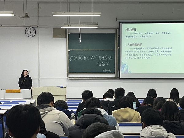 为充分发挥榜样力量,宣传先进典型。11月20日,农学院分别在求知楼A105和求知楼A107举办“责任·成才”先进事迹报告会。农学院党委副书记张轶辉、专职辅导员薛晶晶、2022级全体同学参加报告会。靳鹏、李斌、马晴稳、刘锡瑞、金永健等五位优秀学生代表担任主讲。报告会分别由农学院团委委员孟浩宇、侯欣悦主持。
