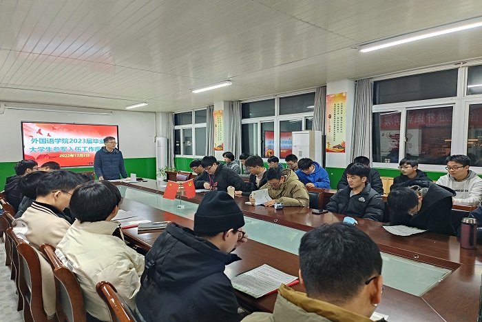 为激发大学生参军的积极性,向毕业生宣传好应征入伍政策,12月2日下午,外国语学院在学院会议室举行2023届毕业生应征入伍座谈会,学院党委副书记张海亮出席会议并做动员讲话,2023届全体男生参加会议。座谈会由学院征兵工作联系人宋兵兵主持。
