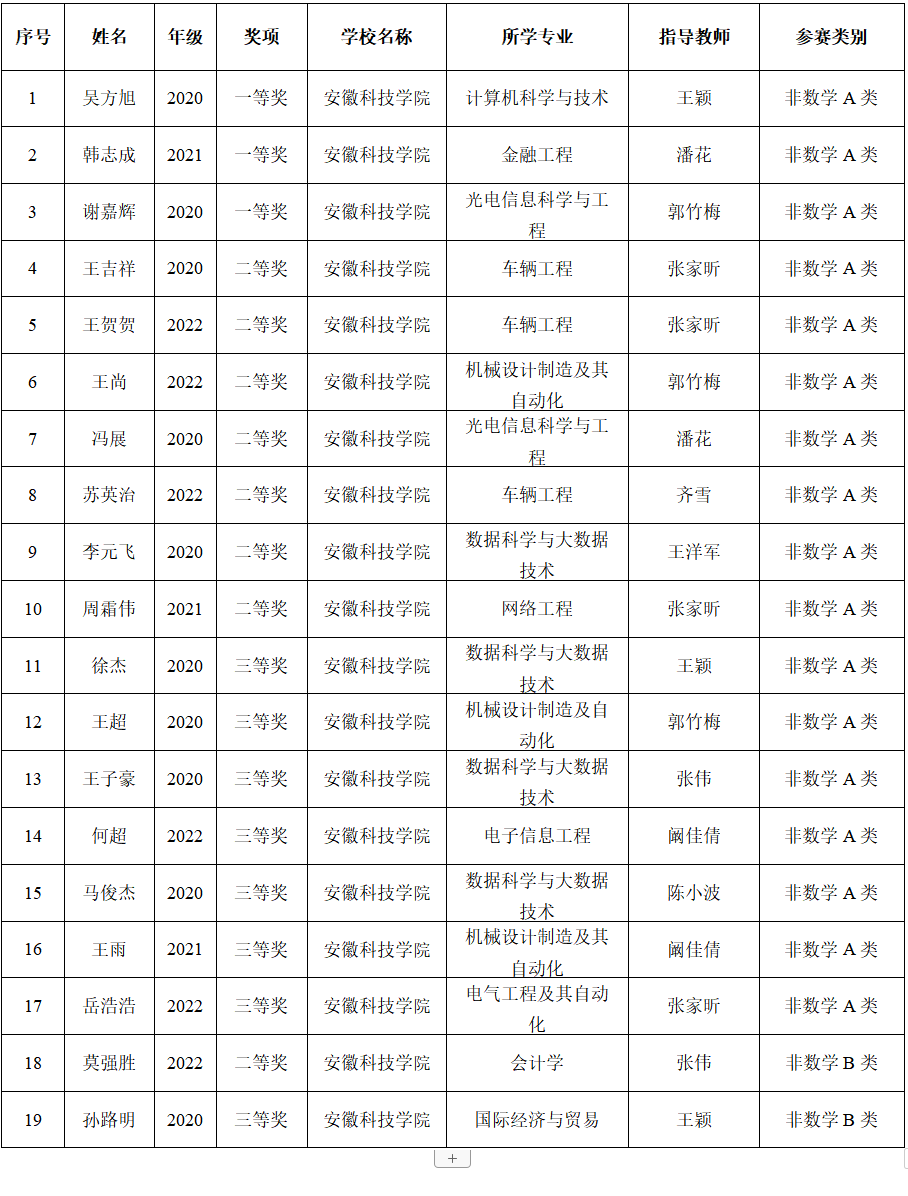 12月26日,第十五届全国大学生数学竞赛初赛结果在中国数学会公告栏公示,我校学生在此次数学竞赛中喜获佳绩。竞赛以笔试闭卷方式进行,安徽40所高校近5000名数学爱好者同台竞技,我校选手准备充分,沉着应试,取得非数学组一等奖3项,二等奖8项,三等奖8项的优异成绩。