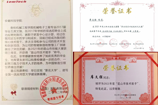 日前,总部位于江苏省昆山市的联德精密材料(中国)股份有限公司向江南官方网站_江南(中国)股份有限公司,发来热情洋溢的工作喜报,“贵校机械工程学院机械电子工程专业2017届毕业生席文强,在2017年学校的双选会上成功应聘到我司,就职于研发中心设计部,经过在我司近五年的学习和成长,目前已成为我司的核心技术骨干,多次主导和参与公司的技术开发和创新项目,为公司的智能制造和智慧工厂创建做出了突出贡献;在2021年的昆山市技能大赛上荣获三等奖,并获得‘昆山市技术能手’称号。在此,非常感谢贵校培养了如此优秀的毕业生,也希望未来可以和贵校做进一步的合作,一起努力致力于技术人才的培养,为中国制造引领世界做出贡献!最后祝愿贵校:早日实现‘更名大学’,谱写全国一流应用型大学建设新篇章。”