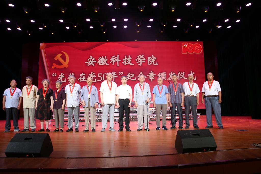 6月30日下午,学校举办庆祝中国共产党成立100周年教职工红歌合唱比赛期间,隆重举行“光荣在党50年”纪念章颁发仪式,为丁为群、代梅英、仲正林、李庆山、李思义、吴明友、张怀金、张学礼、张景法、陈玉胜、崔贤仪、潘成德等12名在校的老党员代表颁发纪念章。颁发仪式现场,院党委书记蒋德勤亲切地走到光荣在党50年党员身边,为他们戴上“光荣在党50年”纪念章,并和他们合影留念。